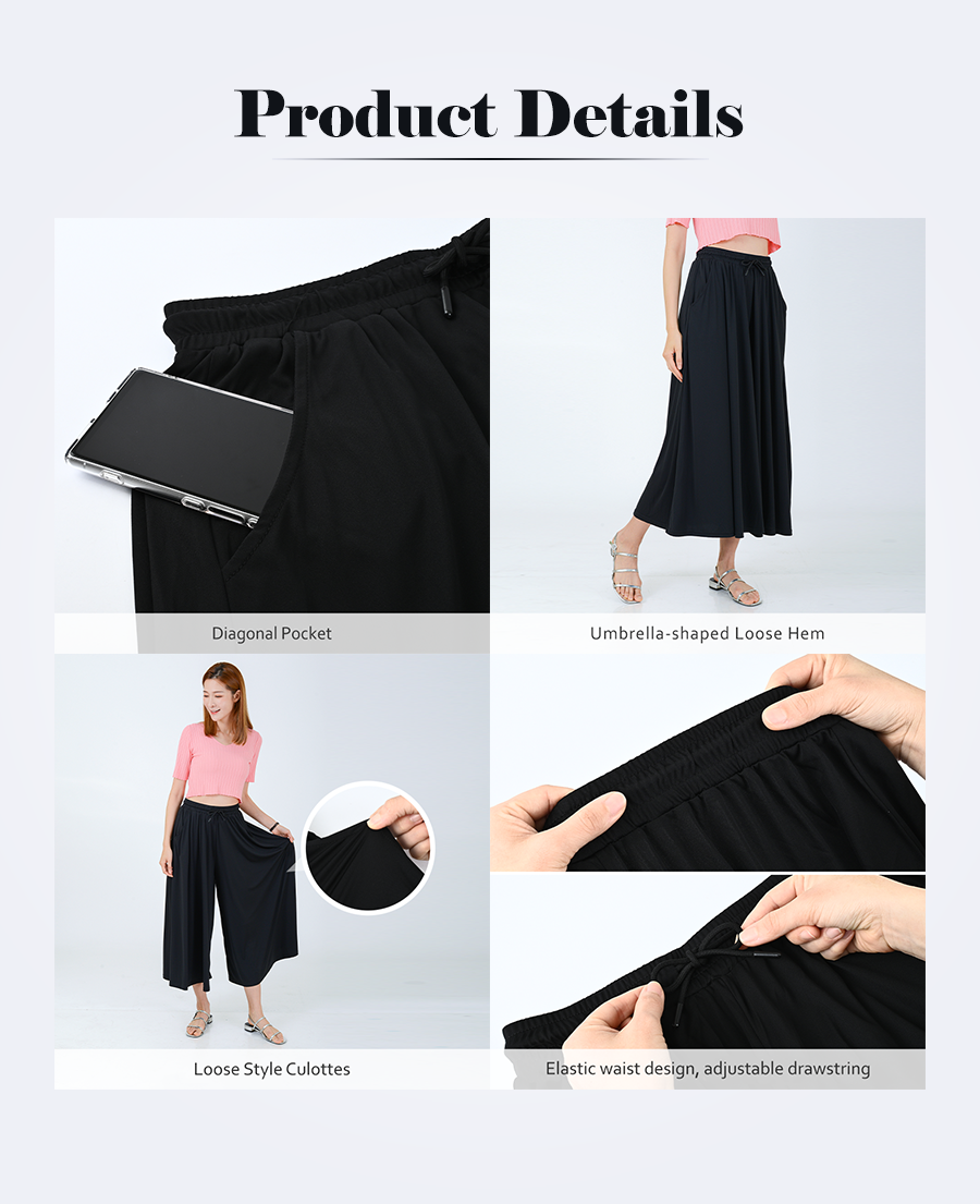Introducing our UPF50+ Lightweight Breathable Culottes, expertly designed to block both UVA and UVB rays. SGS-certified for superior moisture-wicking and anti-bacterial properties, these culottes are as functional as they are stylish. Features include a diagonal pocket, umbrella-shaped loose hem, and a loose fit for effortless style. The elastic waist and adjustable drawstring guarantee a perfect fit. Enjoy the soft, ultra-thin fabric for unparalleled comfort while enjoying the outdoors.