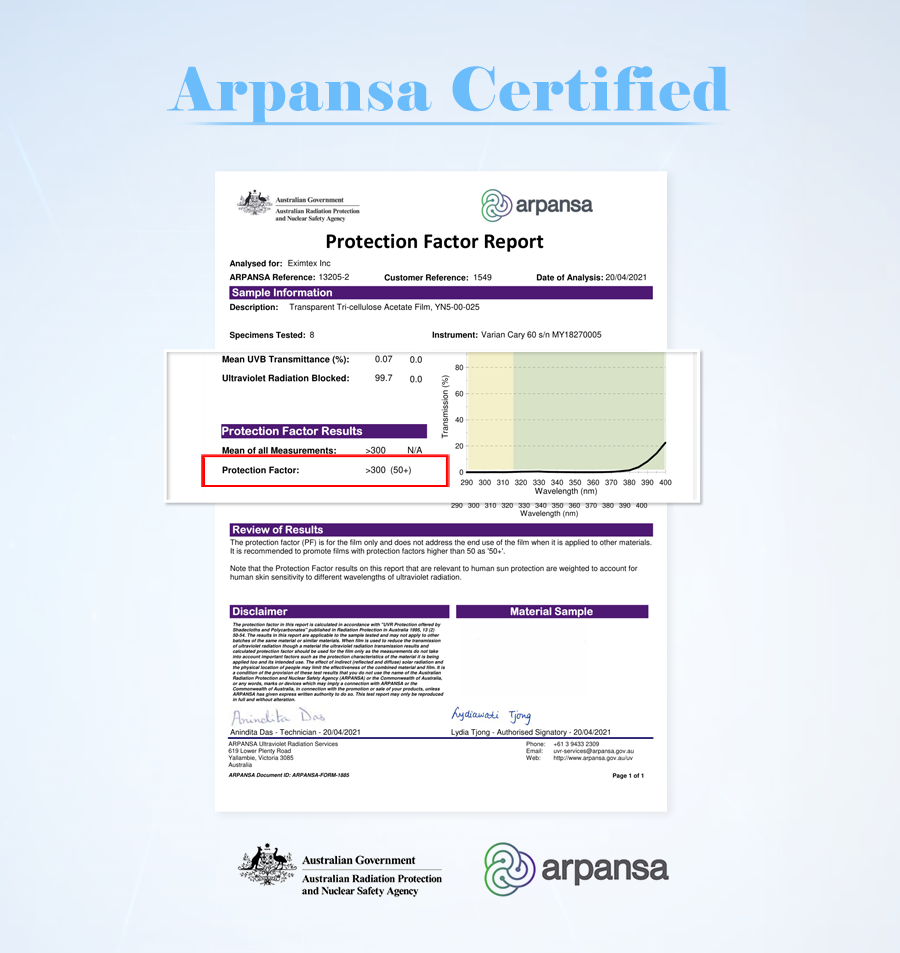 • ARPANSA certified UPF50+, blocks UVA and UVB rays