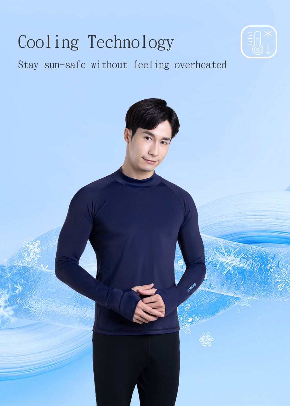 A men’s long-sleeve swim top designed for ultimate sun protection. Featuring UV-blocking technology that shields 99% of harmful rays and cooling fabric for a refreshing feel. The sleek rash guard design exudes a lightweight, vibrant style perfect for water activities.