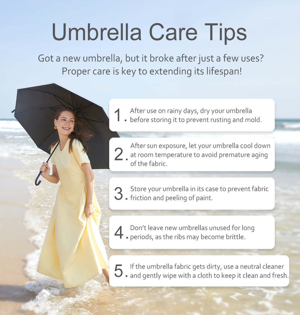 • If the umbrella fabric gets wet, let it dry before storing to prevent metal parts from rusting and to extend the umbrella's lifespan.