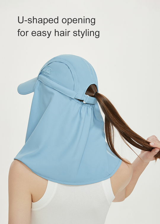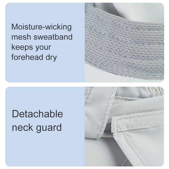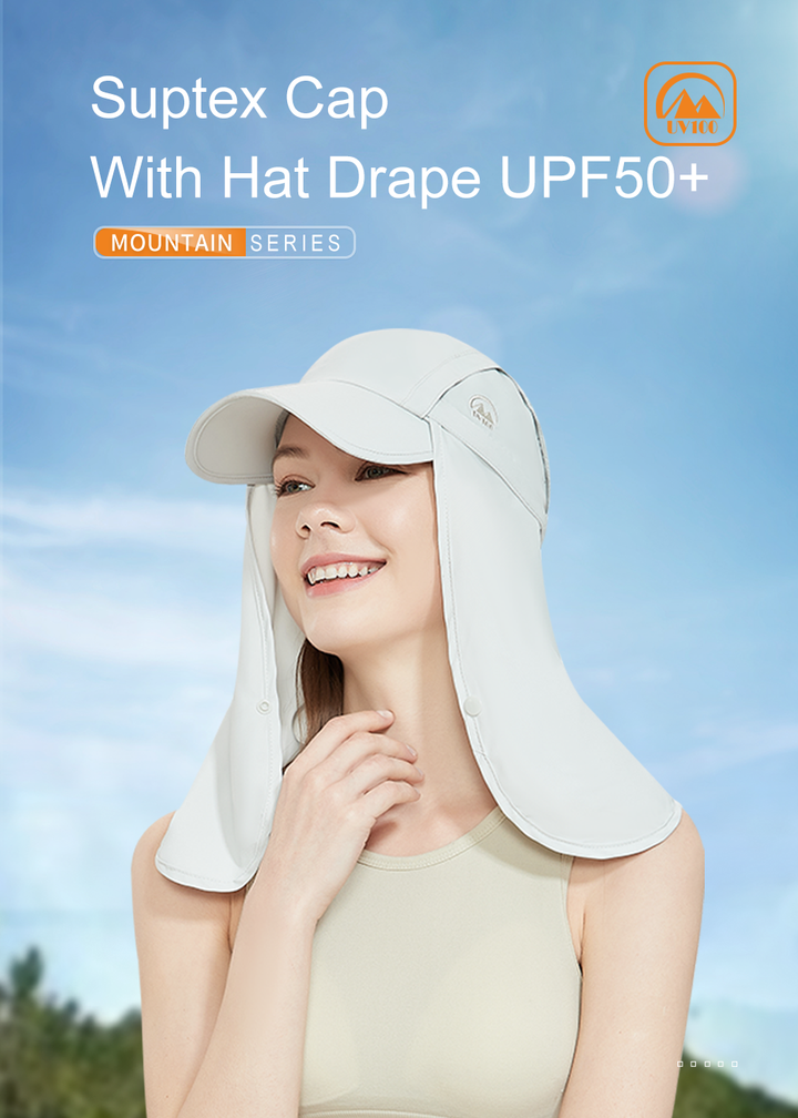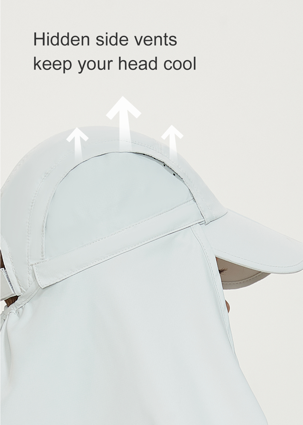 Japanese-style sun protection hiking hat with neck cover shields against UV rays and insects. Featuring Suptex cooling technology with UPF50+ maximum protection and 2x cooling sensation, the fabric offers permanent performance that remains effective after washing.