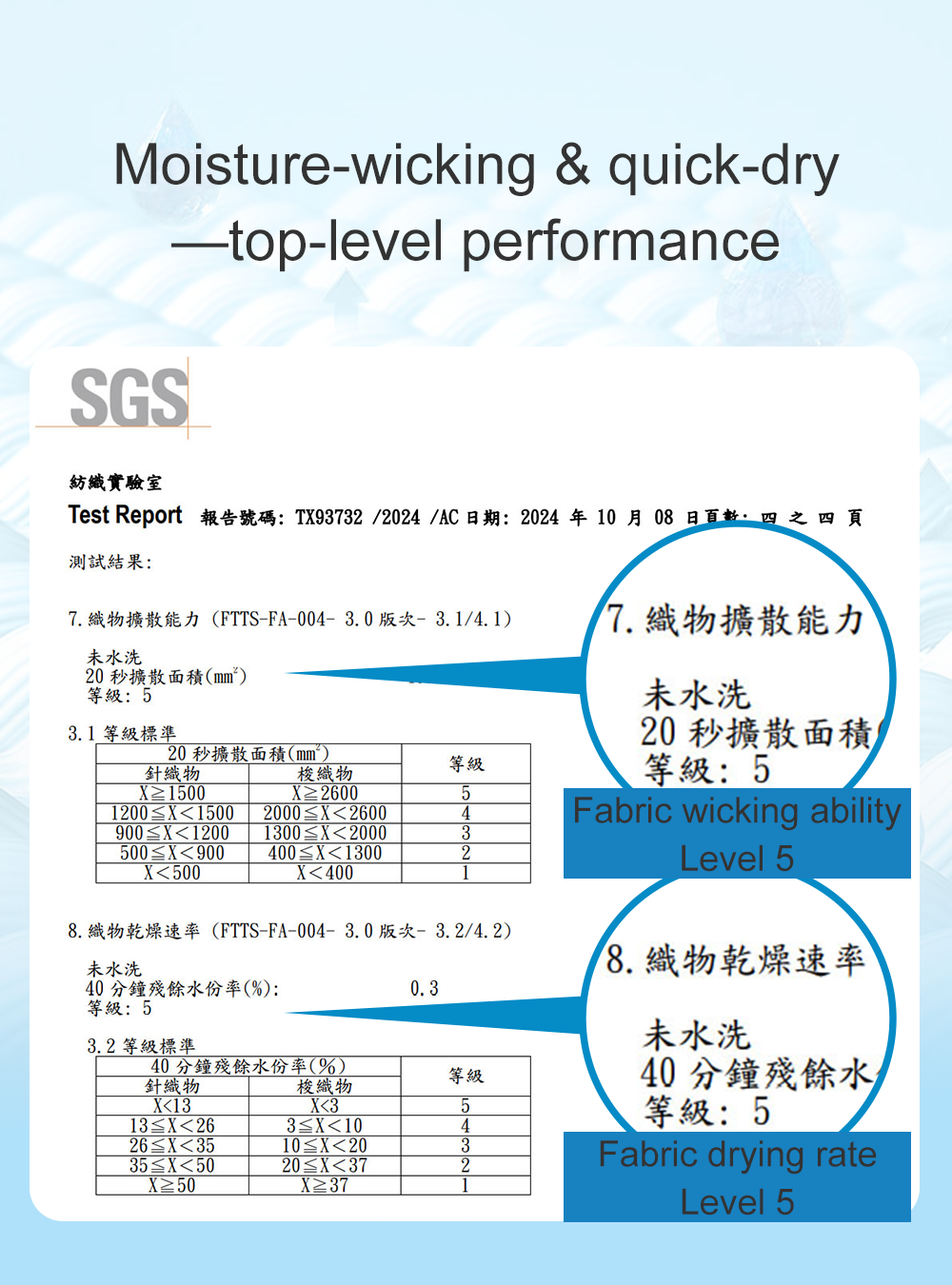• TTRI-certified cooling sensation, SGS-certified moisture wicking