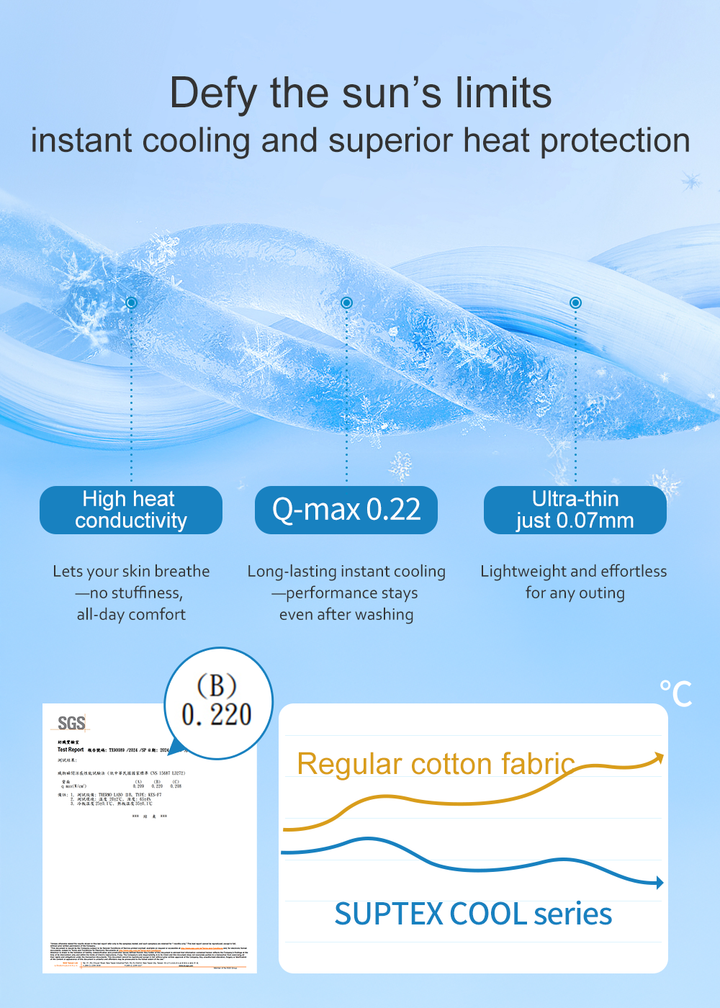 Our Suptex-Cool collection boasts ultra-thin, paper-like fabric at just 0.07mm, offering a lightweight feel. With exclusive technology, it provides permanent cooling and sun protection, remaining unaffected by washing, and is free from harmful chemicals. Durable and soft, it's also SGS certified for instant cooling and moisture-wicking, with a super cooling 0.343 Q-max index.