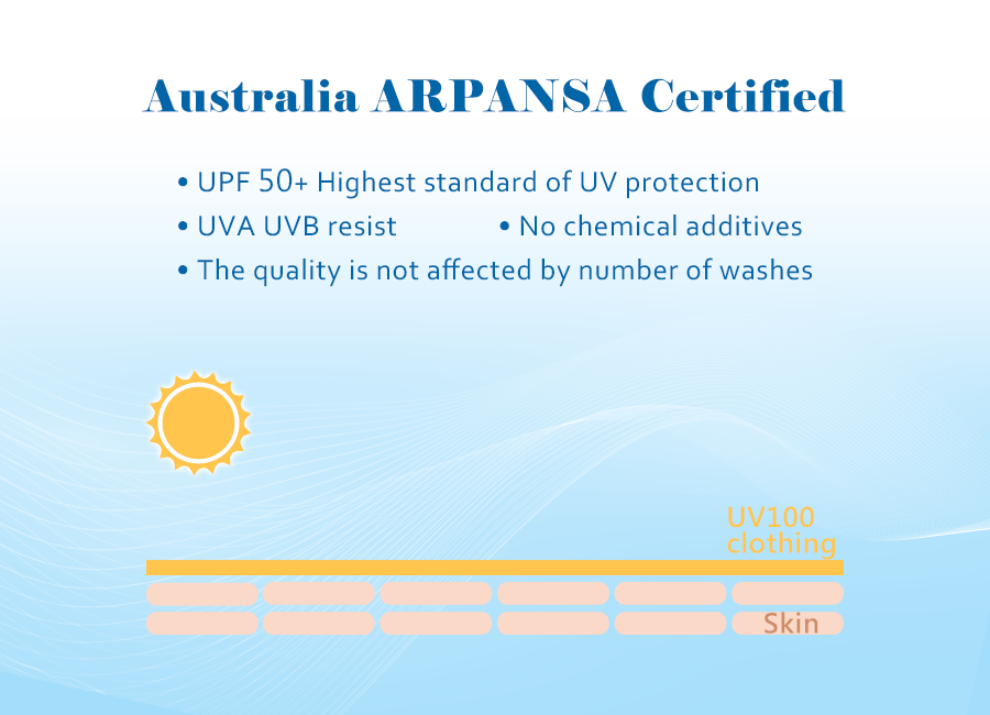 All UV100 fabrics undergo rigorous testing and receive a UPF50+ rating from ARPANSA, the official Australian government agency, meeting AS 4399:2020 standards