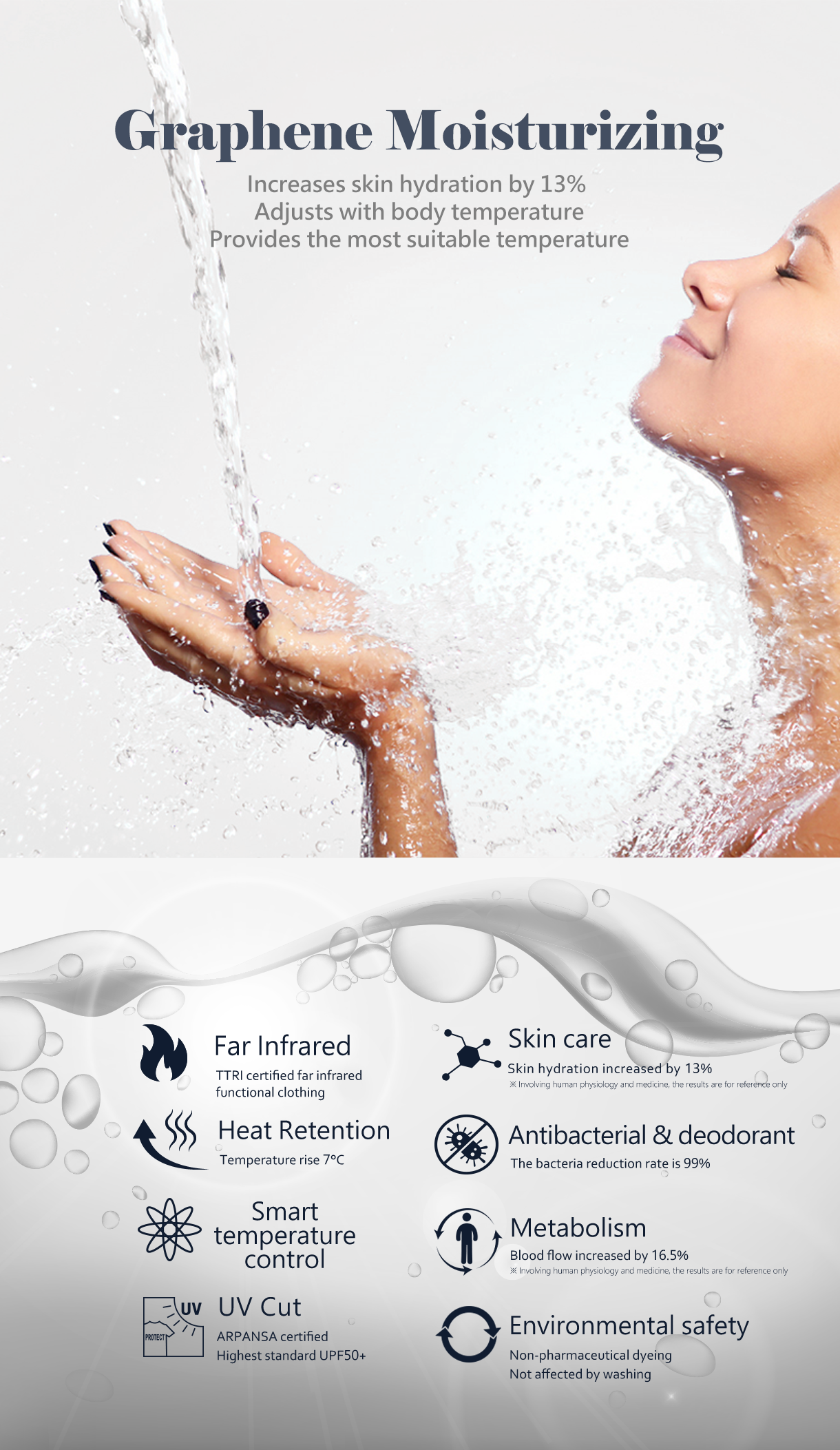 Experience the power of advanced technology with our Graphene Moisturizing Collection "fast heating" and Far Infrared "circulating heat" system. Utilizing the sun's warmth and your body’s natural heat, this innovative approach regulates temperature and promotes metabolism by effectively increasing blood flow. Enjoy enhanced skin hydration with a 13% increase in water retention and long-lasting antibacterial protection, with a bacteria reduction rate of up to 99.9% for 24 hours. Discover a new level of comfort and hygiene that lasts all day.