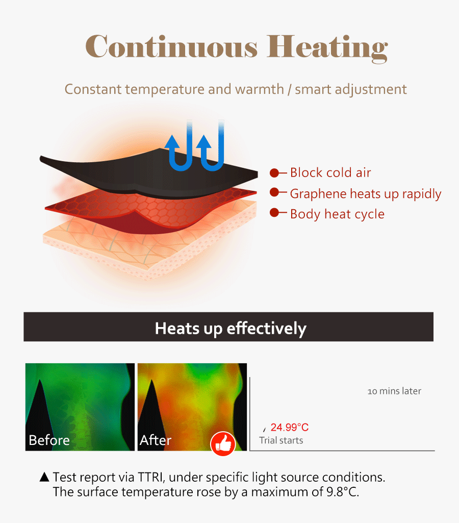 • Graphene + Far Infrared Heat Retention boosts warmth with a maximum temperature rise of 9.1°C