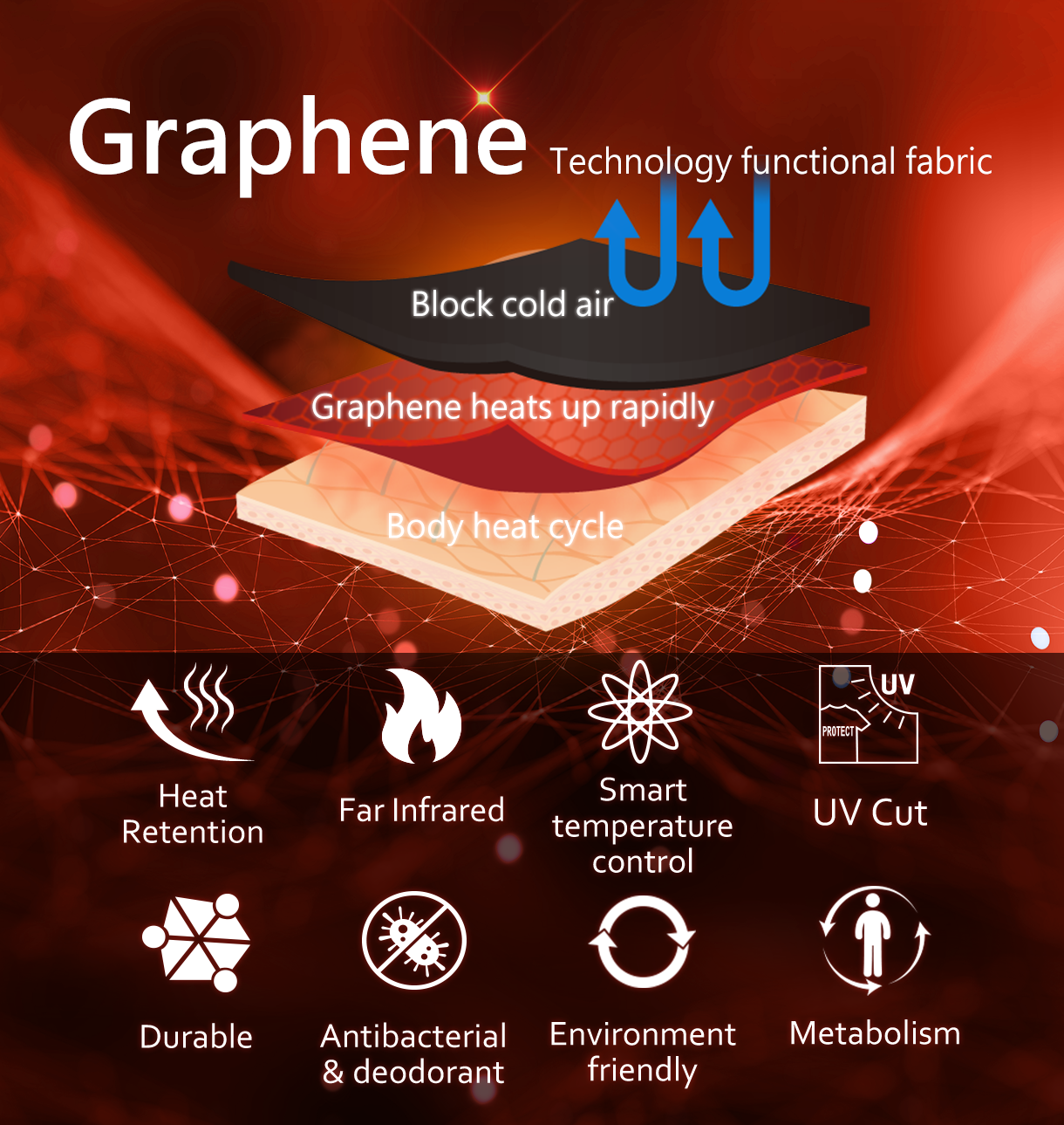 The Graphene Collection, featuring "fast heating" graphene technology combined with Far Infrared "circulating heat" to raise your body temperature by up to 9.5°C. Far Infrared rays harness the warmth of the sun and your body to regulate temperature naturally. This collection also promotes metabolism, increasing blood flow by 17%, while reducing static electricity caused by friction between fabric and skin. Additionally, it effectively reduces bacterial growth, keeping you fresh and comfortable throughout the day.