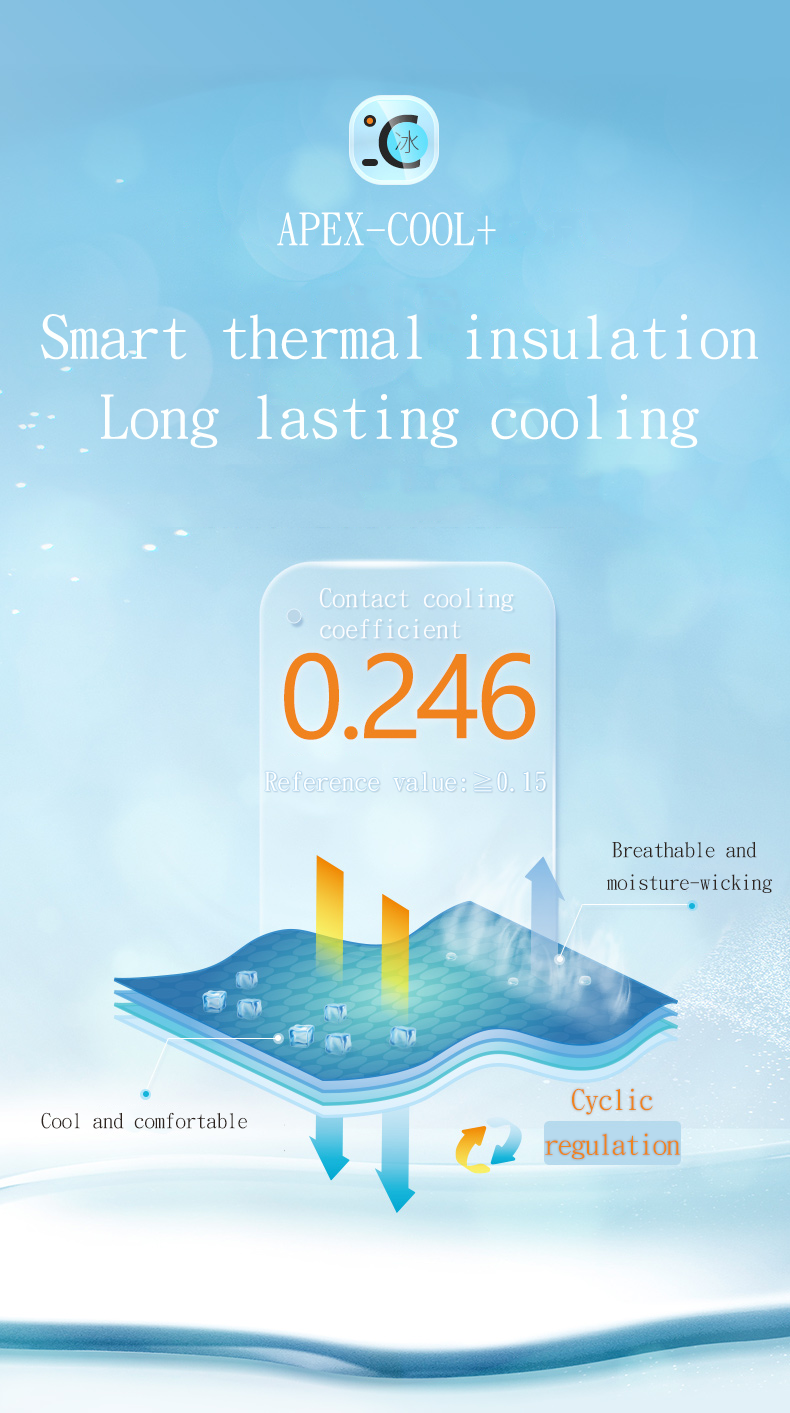 Our Apex-Cool+ collection offers over 99.9% antibacterial protection. Using exclusive technology, it features radiative cooling fabric that absorbs and dissipates heat for lasting cooling and sun protection. Free from harmful chemicals, it withstands washing without losing effectiveness. Durable, soft, and SGS certified, it delivers instant cooling with a 0.326 Q-max index and superior moisture-wicking. Resistant to pilling and color fading.