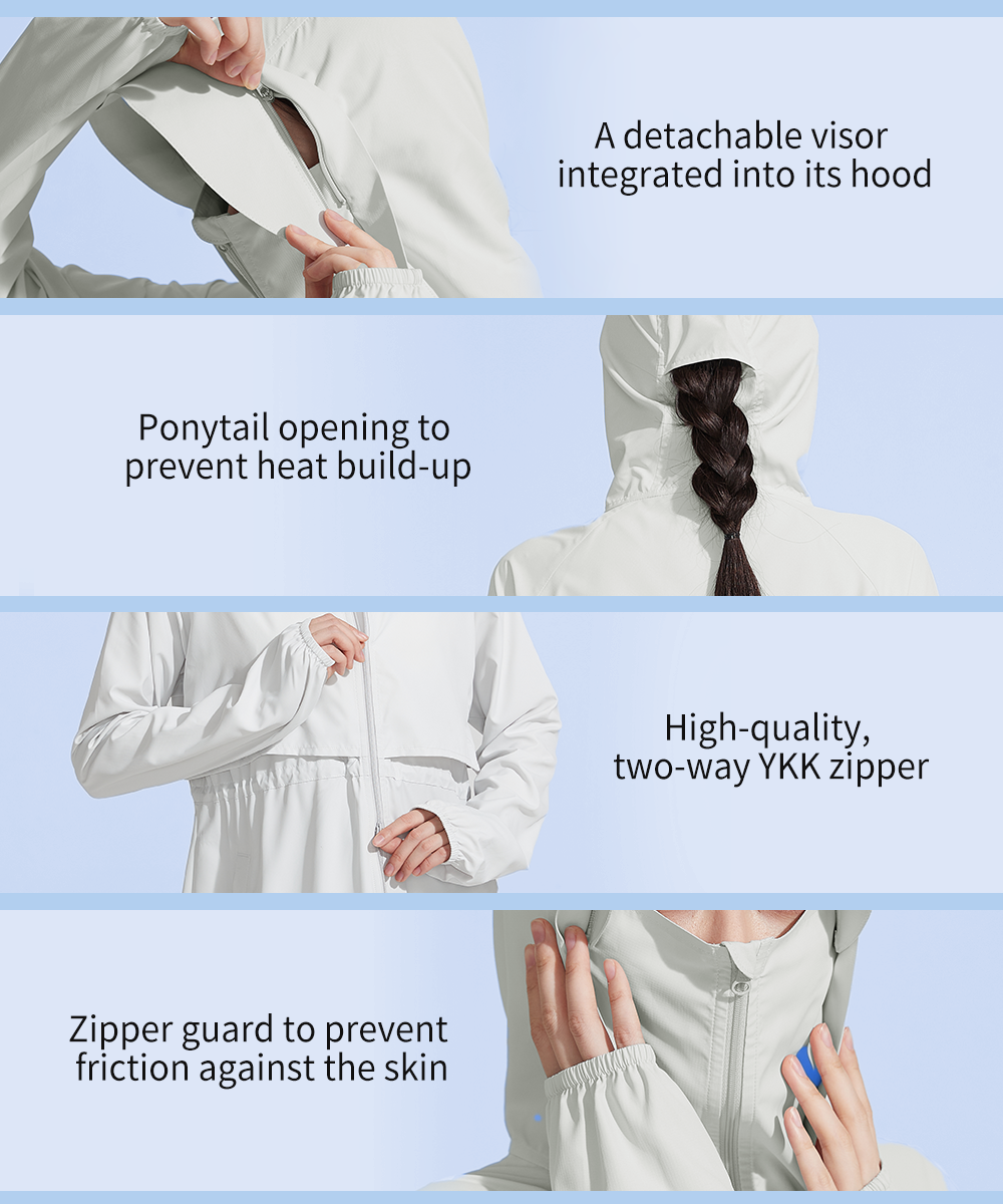 This versatile jacket includes a detachable visor integrated into its hood, an adjustable cinched waist for a customized fit, and a hooded face mask design for added protection. Ventilation holes front and back promote airflow and heat dissipation, while the shorter front, longer back, and umbrella-shaped hemline create a flattering, slimming effect. Lightweight, packable, and multifunctional, it's perfect for a long day outdoors.